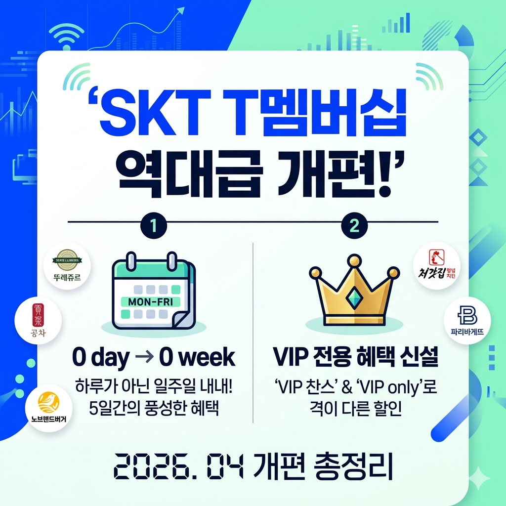 SK텔레콤의 이번 T멤버십 개편은 **'시간적 제약 완화(0 week)'**와 **'등급별 보상 강화(VIP)'**로 요약할 수 있습니다.